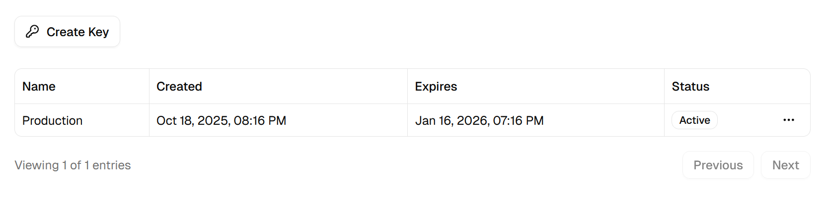 Here you can create a new key by providing a name and validity period. Make sure to copy the generated key because you’ll not see it again.